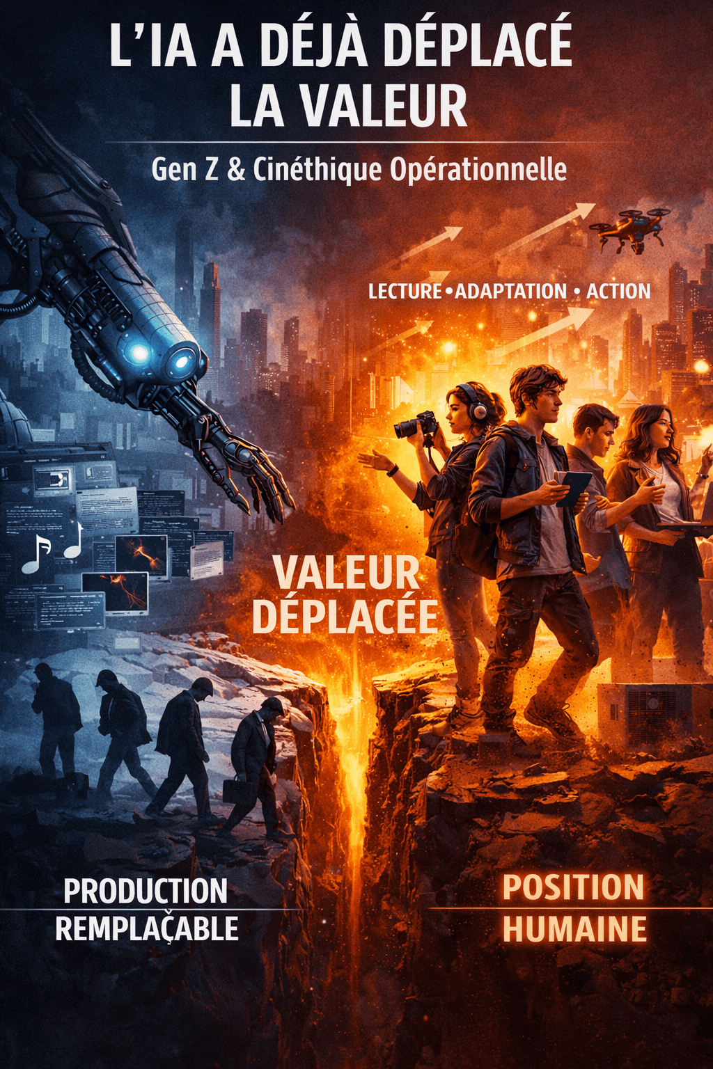 Dans ce nouveau paysage, l’IA et la Gen Z ne s’opposent pas. Elles transforment ensemble la structure de la valeur. L’IA rend la production accessible à tous. La Gen Z utilise cette accessibilité pour créer des situations. L’IA génère du contenu. La Gen Z crée des contextes. L’IA produit. L’humain met en mouvement. La différence devient fondamentale. La production seule ne suffit plus. Ce qui compte, c’est l’activation. Un texte généré ne vaut que s’il est lu. Une image générée ne vaut que si elle circule. Une musique générée ne vaut que si elle est vécue. La valeur se déplace vers la capacité à déclencher une situation réelle.C’est pour cette raison que le diplôme perd progressivement son rôle protecteur. Le diplôme certifie une compétence. Mais la compétence devient automatisable. Ce qui devient rare, c’est la capacité à comprendre un moment, à voir une opportunité avant les autres, à s’insérer dans une dynamique vivante. La Cinéthique Opérationnelle formalise cette capacité. Elle propose une lecture du réel basée sur le mouvement plutôt que sur la structure. Elle invite à observer les systèmes humains comme des ensembles dynamiques, où la valeur circule et se déplace.